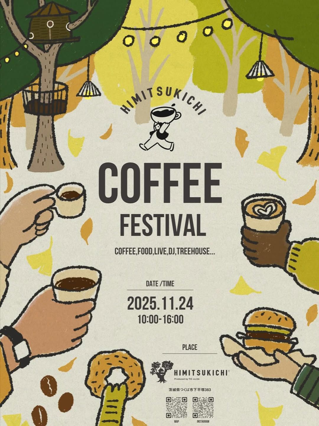 昨年よりも店舗数が大幅に増えて16のコーヒーショップとキッチンカーが集結するようですね!ACID COFFEEやBEAN TREK Coffee Roastersなど、茨城県内外から個性豊かなコーヒーが楽しめます。さらにツリーハウス下のステージではライブパフォーマンスやDJイベントも開催予定で、コーヒーと音楽、フードが一体となった特別な空間が広がりそうですよ!