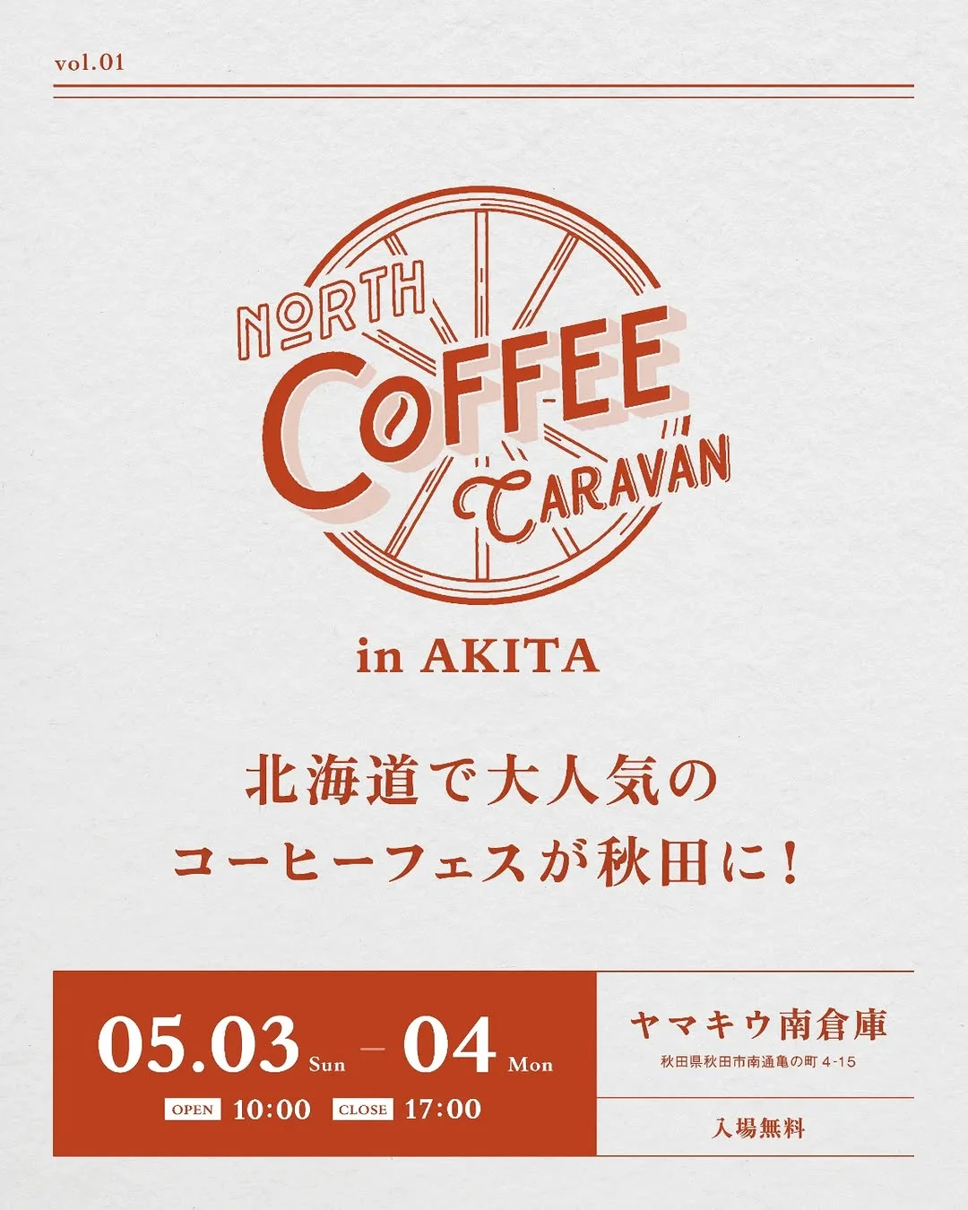 北海道で人気のコーヒーイベント「North Coffee Caravan」が秋田市にやってきます。北海道の人気コーヒーショップ、愛知のロースター、そして東北中のお菓子屋さんが一堂に集結。ゴールデンウィークに秋田市のヤマキウ南倉庫で開催され、お得な飲み比べも楽しめます。