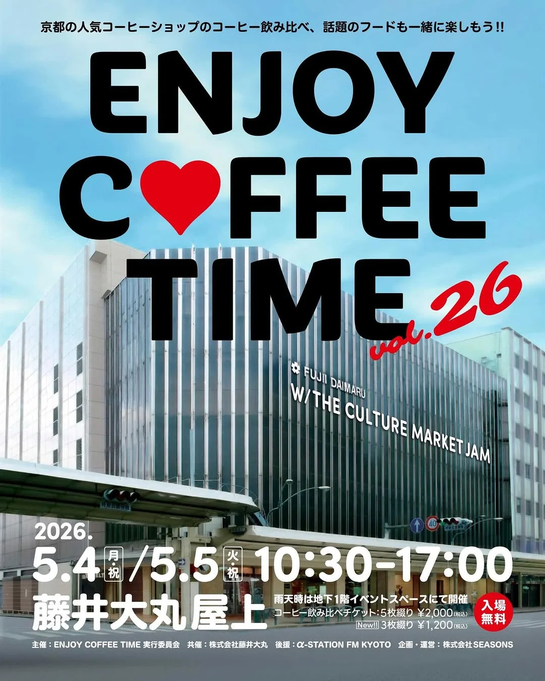 京都の藤井大丸奥上で開催されるコーヒーイベント。 雨天時は地下1階イベントスペースにて開催されるので雨でも安心なのが嬉しいポイント。 飲み比べチケットは3枚綴りと5枚綴りがあるようなので自分のスタイルに合わせてお好きなものを入手してくださいね!