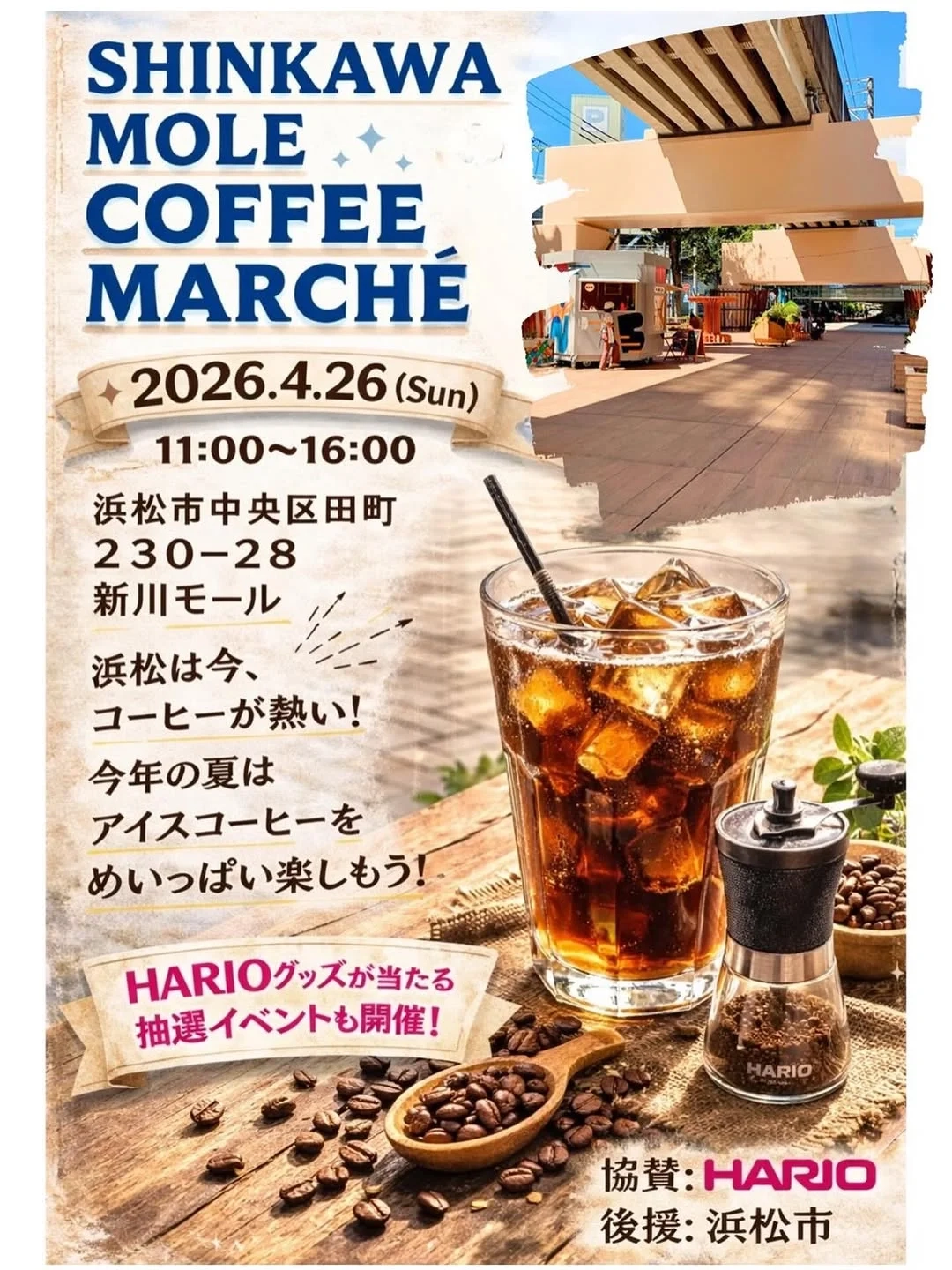 浜松の新川モールで開催されるコーヒーマルシェ。 複数のコーヒーショップが出店し、コーヒーの飲み比べが楽しめます。HARIO様の協賛により、4店舗以上を回った来場者を対象にドリッパーやサーバー、グラスが当たる抽選会もあるそうですよ!