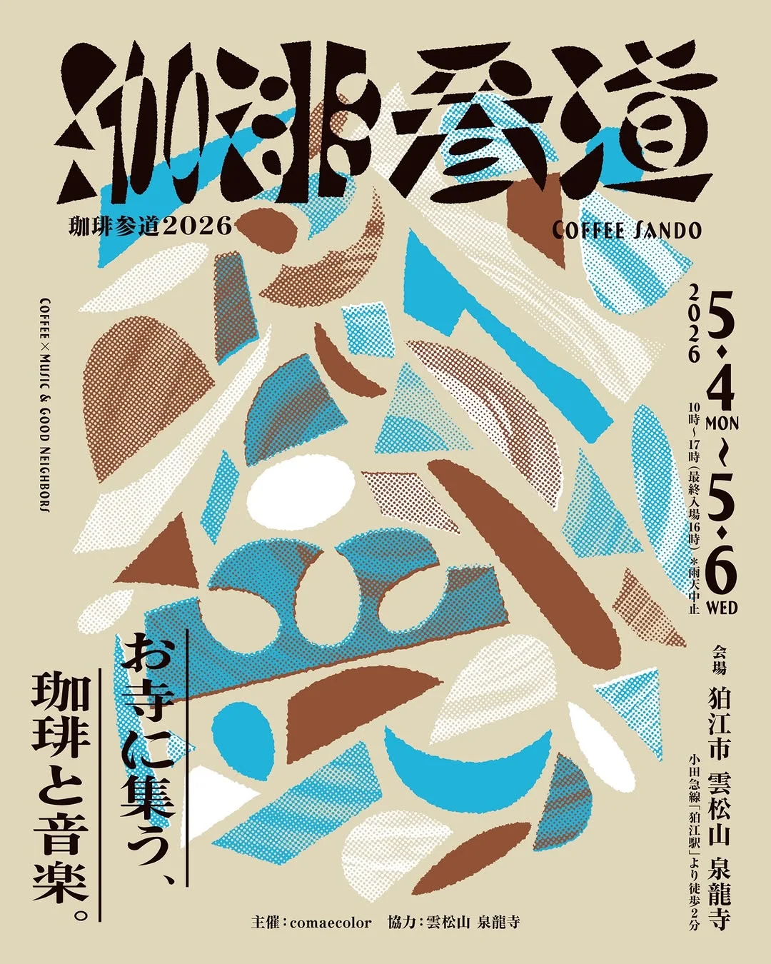 東京都狛江市の泉龍寺で開催されるコーヒーフェスティバル。 ゴールデンウィークの新緑に包まれたお寺を舞台に、日替わりで全18店のコーヒーロースターと、15組のアーティストによる音楽ステージが繰り広げられます。 海外ロースターの出店も初となり、個性豊かな新たな出店者も参加。コーヒーとともにフードやスイーツ、ワークショップ、ショップも多数出店し、多彩な魅力が詰まった3日間となりますね! ぜひ予定に加えてみてくださいね!